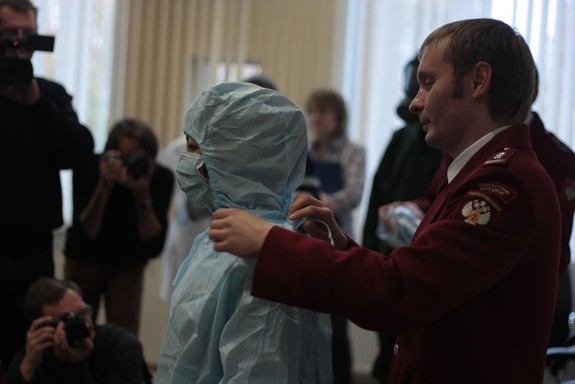 На пресс-конференции продемонстрировали: двухступенчатую систему контроля уровня температуры пассажиров, систему контроля состояния пассажиров непосредственно в самолете, который приземлился, систему эвакуации пассажиров из самолета в случае подозрения и/или подтверждения информации о заболевании одного из пассажиров прилетевшего самолета. Сотрудники санитарно-карантинного пункта показали специальный защитный противовирусный костюм, который используется при контакте с больными, зараженными высококонтагиозными вирусами, в том числе, вирусом Эбола.